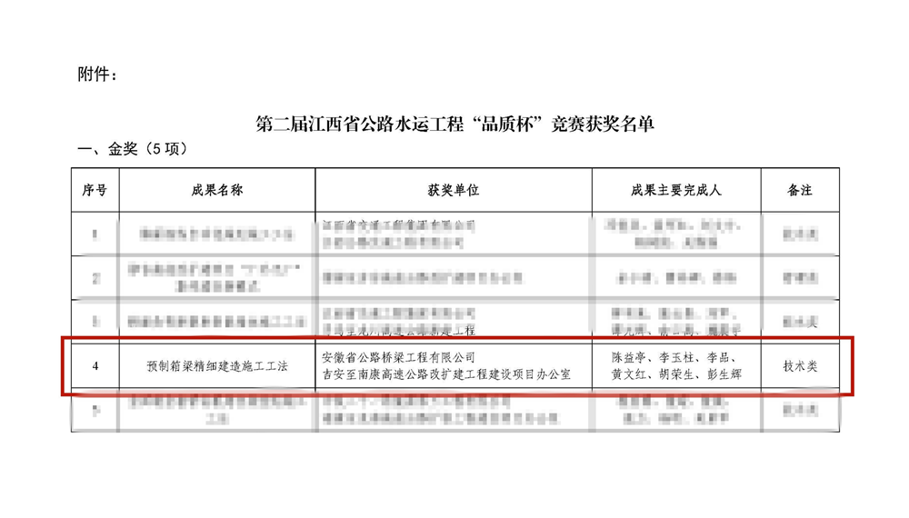 近日,江西省交通運輸廳發(fā)布了第二屆江西省公路水運工程“品質(zhì)杯”競賽結果,公司承建的吉康改擴建C1標項目“預制箱梁精細建造施工工法”榮獲金獎。