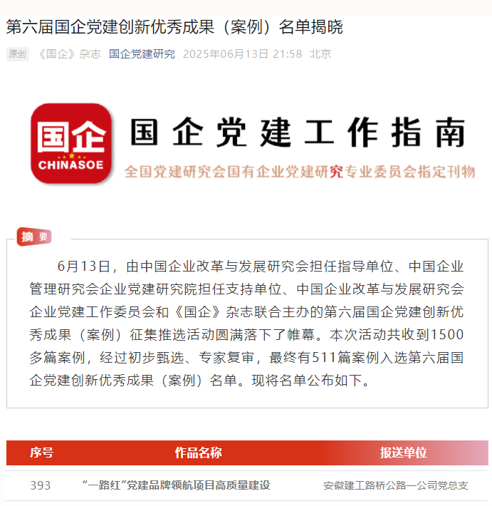 近日,中國企業(yè)改革與發(fā)展研究會企業(yè)黨建工作委員會和《國企》雜志聯(lián)合主辦的第六屆國企黨建創(chuàng)新優(yōu)秀成果(案例)征集推選活動圓滿落下帷幕,公司《“一路紅”黨建品牌領(lǐng)航項目高質(zhì)量建設(shè)》黨建案例從1500多篇案例中脫穎而出,獲評第六屆國企黨建創(chuàng)新優(yōu)秀成果(案例)。