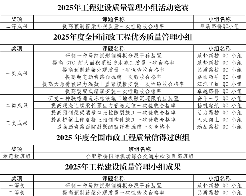 近日,中國市政工程協(xié)會、中國建筑業(yè)協(xié)會、中國施工企業(yè)管理協(xié)會先后公布2025年度質(zhì)量管理小組及班組活動成果大賽評選結(jié)果,公司共斬獲15項國家級獎項。
