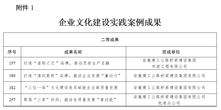 近日,中國施工企業(yè)管理協(xié)會(huì)發(fā)布2025年企業(yè)文化建設(shè)實(shí)踐案例成果,公司選送的案例《打造“盾構(gòu)之芯”品牌,推動(dòng)思政生產(chǎn)互融”》《打造“清風(fēng)路橋”品牌,激活企業(yè)發(fā)展“廉動(dòng)力”》《“三位一體”文化建設(shè)體系賦能企業(yè)高質(zhì)量發(fā)展》《聚焦“三育”協(xié)同,激活高質(zhì)量發(fā)展“青動(dòng)能”》,從全國1000余個(gè)參評案例中脫穎而出,成功入選企業(yè)文化建設(shè)實(shí)踐案例二等成果,充分展現(xiàn)了公司多年來在企業(yè)文化建設(shè)方面的累累碩果。