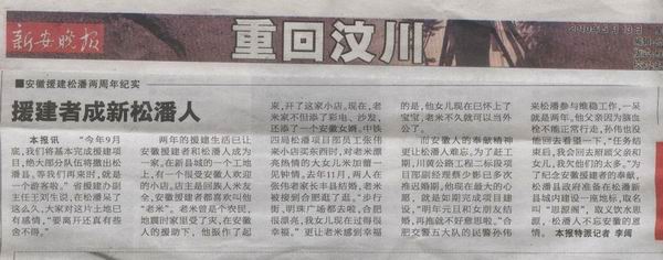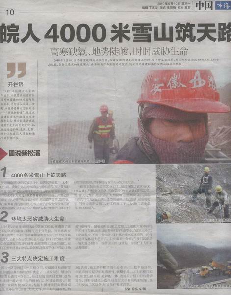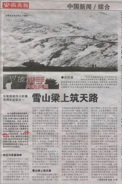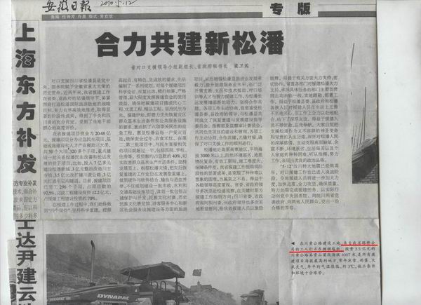 在“5.12”汶川大地震發(fā)生兩周年之際,安徽省路橋公司承建的我省對(duì)口援建四川松潘縣項(xiàng)目之一——漳黃公路道路改建工程02標(biāo)再次引起省內(nèi)各大主流媒體的高度關(guān)注。2010年5月12日《安徽日?qǐng)?bào)》以專版形式發(fā)表了我省對(duì)口支援領(lǐng)導(dǎo)小組副組長(zhǎng)、省政府秘書長(zhǎng)梁衛(wèi)國(guó)文章《合力共建新松潘》,對(duì)安徽路橋在施工條件和環(huán)境十分艱苦的情況下表現(xiàn)出來的優(yōu)良政治品格給予了充分肯定。5月11日安徽電視臺(tái)第一時(shí)間欄目記者在海拔4000米以上的施工現(xiàn)場(chǎng)采訪了項(xiàng)目副經(jīng)理蔡少影同志。5月10日《新安晚報(bào)》、《安徽市場(chǎng)報(bào)》等均以??问綀?bào)道了公司援建項(xiàng)目。
