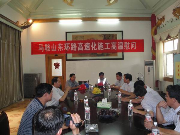 在我項目部大廳,王書記首先發(fā)表了熱情洋溢的講話,高度贊揚了我項目勇戰(zhàn)高溫、搶抓工期、誓保質(zhì)量的大無畏施工精神。隨后,王書記又送上了慰問信,并與員工代表們一一握手,發(fā)放慰問金、慰問品。最后,在項目部會議室,王書記一行與蘇指揮長,蔡主任、江主任,總監(jiān)代表郭亮以及我部項目經(jīng)理冷峰等進行座談,詳細了解了我南環(huán)02標項目的整體情況以及近期施工的進展情況,希望我部繼續(xù)發(fā)揚安徽省路橋公司攻堅克難的優(yōu)良傳統(tǒng),保質(zhì)保量的如期完成東環(huán)02標項目建設(shè)任務(wù)。