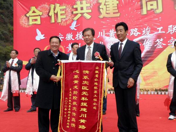 十月的松潘,金風(fēng)送爽,喜事連連。10月14日,安徽援建川黃公路竣工聯(lián)歡會(huì)暨黃山黃龍戰(zhàn)略合作簽字儀式在美麗的黃龍風(fēng)景區(qū)廣場(chǎng)隆重舉行。安徽省政府秘書(shū)長(zhǎng)梁衛(wèi)國(guó)、省交通廳副廳長(zhǎng)丁慶領(lǐng)及四川省、阿壩州、松潘縣各級(jí)領(lǐng)導(dǎo)出席儀式。我公司總經(jīng)理汪衛(wèi)東、黨委書(shū)記陳光磊以及漳黃02標(biāo)項(xiàng)目經(jīng)理陳莘同志作為特邀嘉賓出席典禮。這標(biāo)志著我安徽路橋?qū)谥г膳苏狞S公路建設(shè)任務(wù)的圓滿完成。