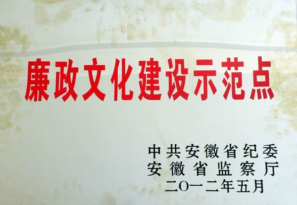 近日,公司被中共安徽省紀(jì)委、安徽省監(jiān)察廳命名為全省第三批廉政文化建設(shè)示范點,成為全省獲此榮譽的17家省屬企業(yè)之一。